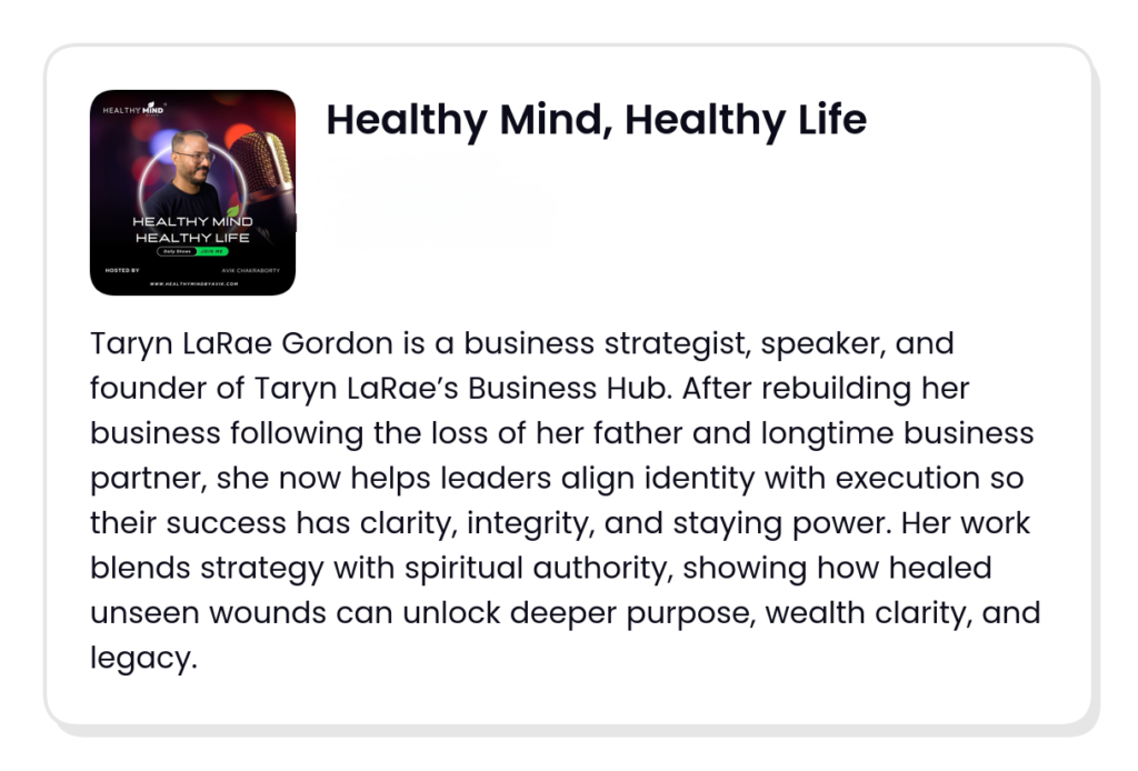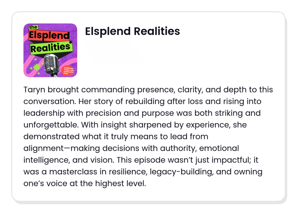 Taryn has always been passionate about empowering individuals to embrace their full potential, live at a higher standard, and reject any societal limitations. Through her thought-provoking insights and emboldened messages, she challenges audiences to think beyond imposed boundaries and step boldly into their purpose with confidence and clarity.